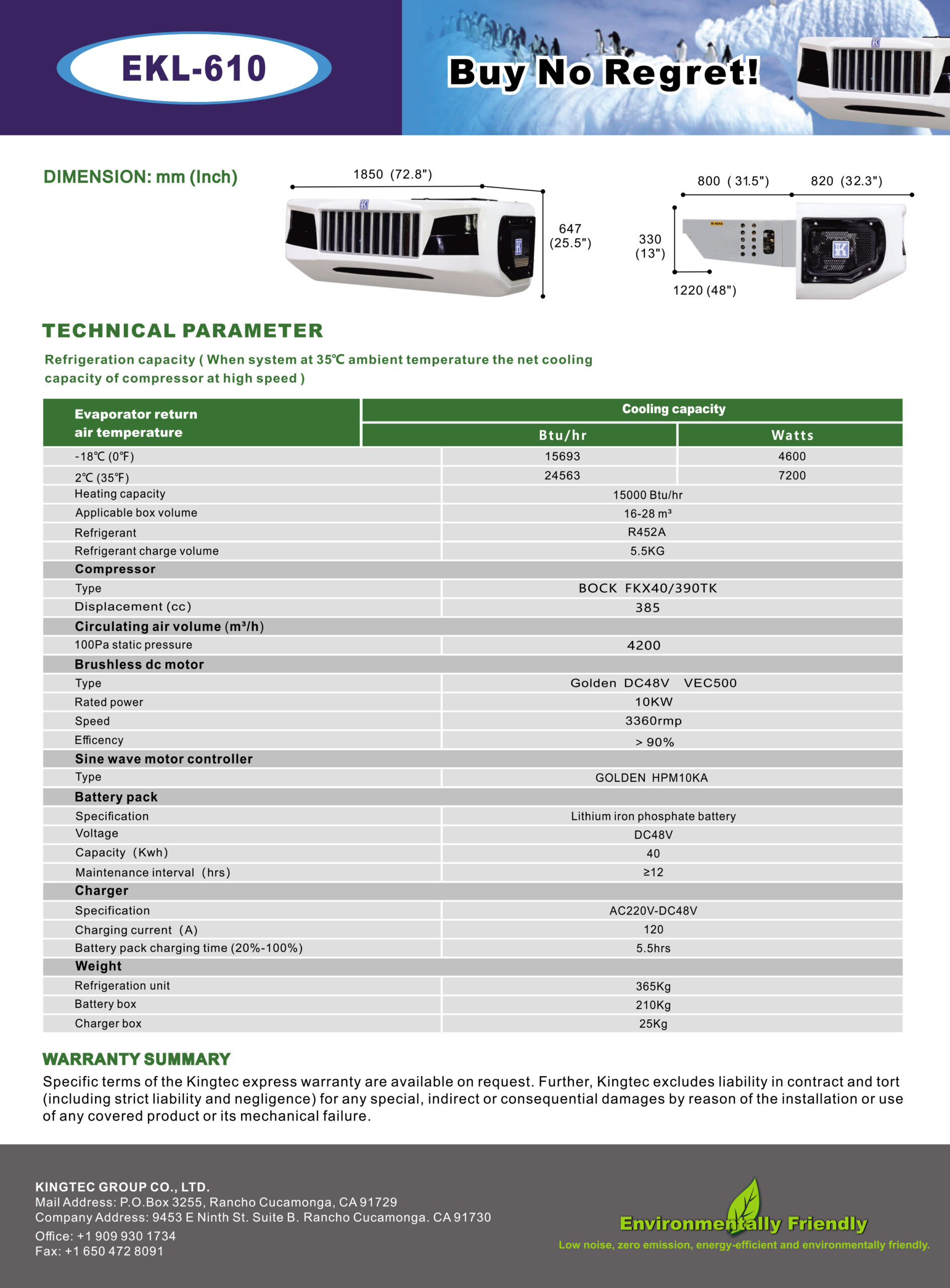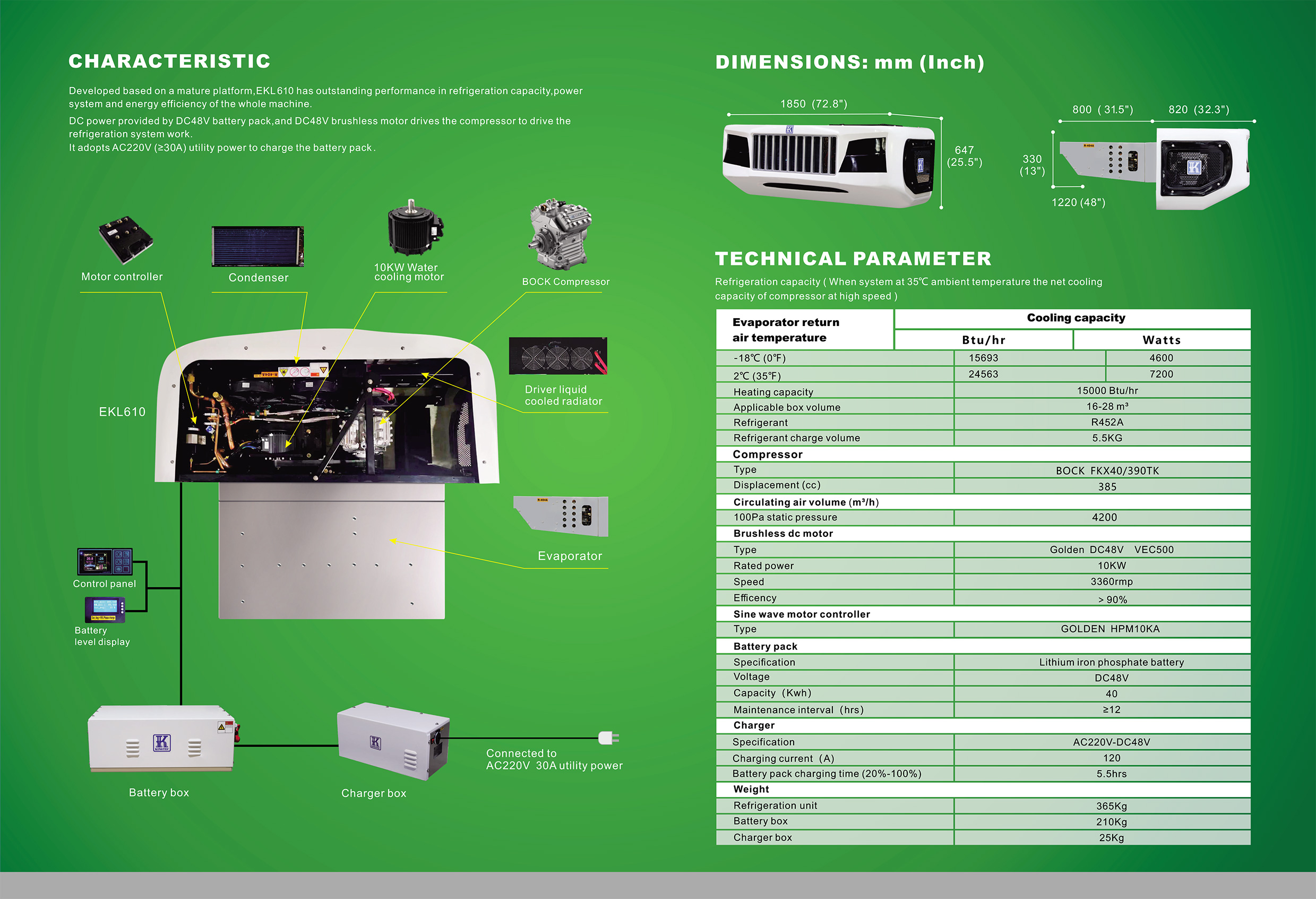 The refrigeration unit uses a DC48V power supply system with its own battery, which can provide independent power. This eliminates the need to consider the power supply when installing the unit in the vehicle. The DC48V power supply system uses a custom-designed lithium iron phosphate battery module with an integrated intelligent BMS. This system has greater advantages over other power supply systems in terms of safety, cycle life, energy density, temperature range and environmental protection. The integrated structure is easy to install. It has a large cooling capacity and cools quickly.