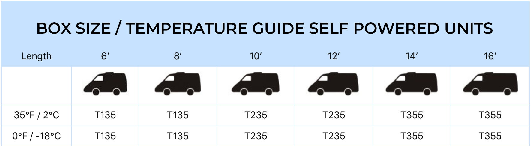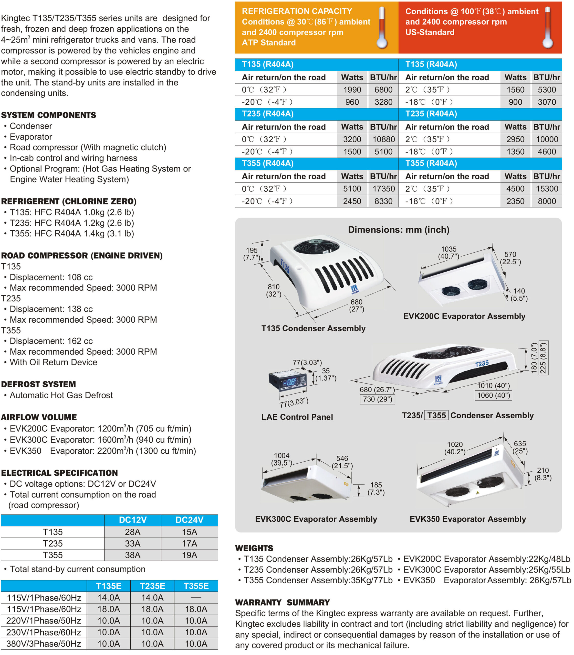 Kingtec’s T355 unit is designed for fresh, frozen and deep frozen applications on the 4~25m3 refrigerator trucks and vans. The road compressor is powered by an electric motor, making it possible to use electric standby to drive the unit. The stand-by units are installed in the condensing units.